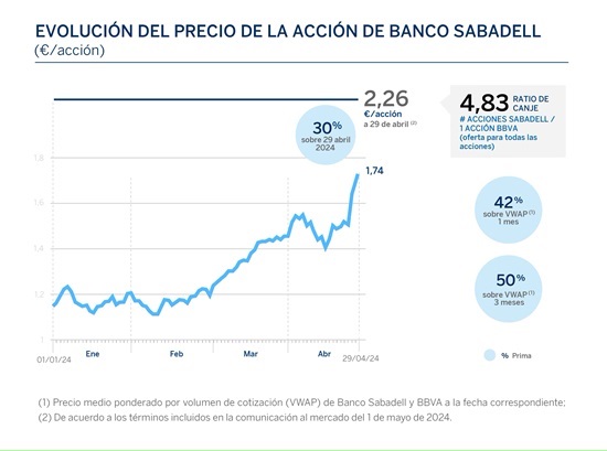 La operación ofrece el canje de una acción de BBVA por 4,83 acciones de Sabadell, lo que supone una prima¹ del 30% sobre los precios de cierre de...