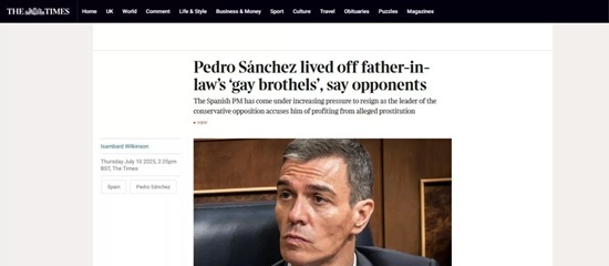 El titular de “The Times” no puede ser más elocuente: “Pedro Sánchez vivía de los ‘burdeles gays’ de su suegro”, dice la oposición. “El primer ministro español se encuentra bajo creciente presión para dimitir mientras el líder de la oposición conservadora lo acusa de beneficiarse de la supuesta prostitución”, reza el subtítulo del diario británico.